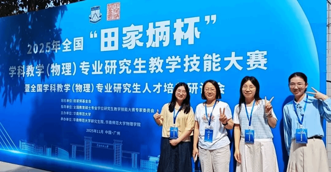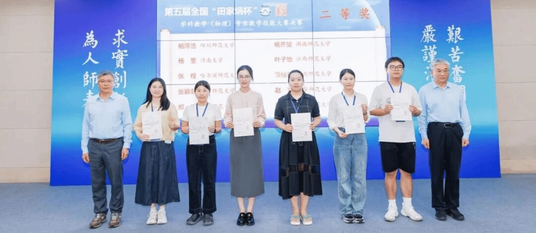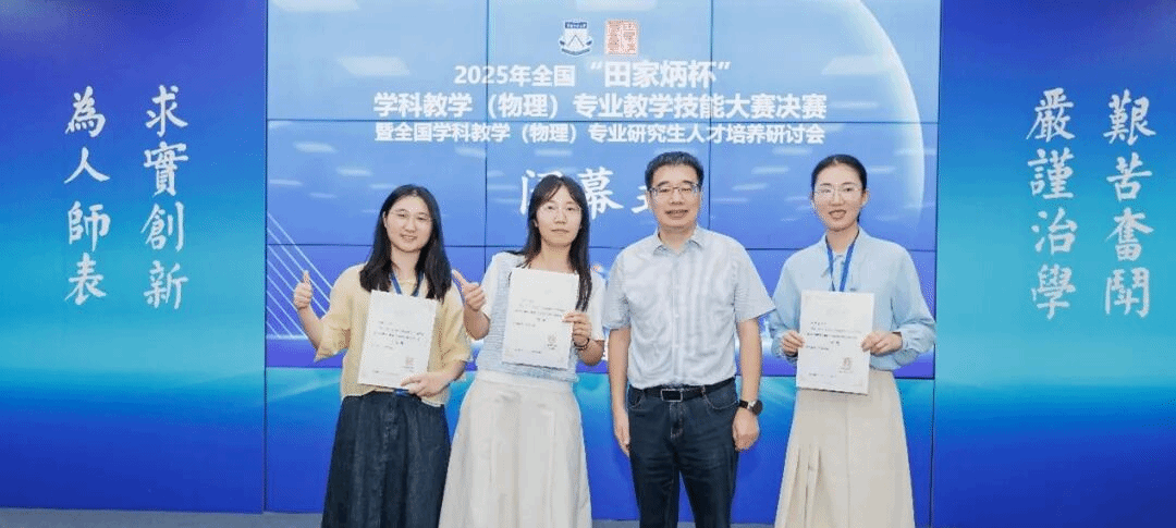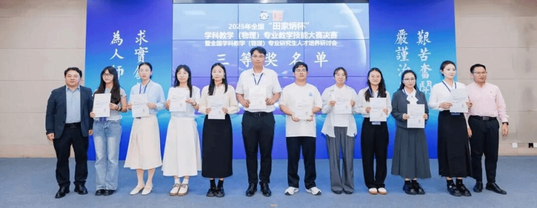 2025年11月6日至9日,全国“田家炳杯”全日制教育硕士专业学位学科教学(物理)专业研究生教学技能大赛决赛暨全国学科教学(物理)专业研究生人才培养研讨会在华南师范大学成功举办。本届比赛共有来自全国93所高校的382名学生报名参赛,经过选拔,共有78所高校的199名优秀选手脱颖而出进入决赛。本次决赛评选出一等奖20名、二等奖40名、三等奖81名、优秀教学设计奖47名、优秀指导教师奖60名。最终,我院周越同学斩获二等奖、王静同学和徐鹏飞同学均摘得三等奖,谢丽老师荣获优秀指导教师奖。