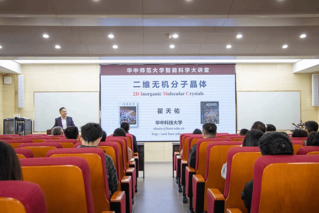 2025年11月4日下午,由华中师范大学科技处主办,智能健康交叉科学中心、物理科学与技术学院协办的第二期 “智能科学大讲堂” 在9 号楼 9557 报告厅顺利举行。本次讲座邀请到华中科技大学材料科学与工程学院翟天佑教授担任主讲人,以“二维无机分子晶体”为主题,聚焦氧化锑(Sb₂O₃)这一核心研究对象展开分享。物理科学与技术学院院长秦广友主持,智能健康交叉科学中心付雪梅研究员、李攀特任研究员、简刚副研究员,学院副院长赵蕴杰及学院师生代表共同参与。