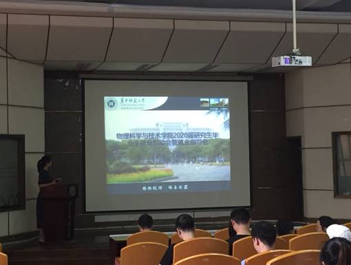 为切实落实招就处2020届毕业生生源信息填报工作,同时针对2020届毕业生的就业工作予以有效指导,物理科学与技术学院于2019年6月5日在九号楼一楼报告厅召开了学院2020届研究生毕业生就业启动会暨就业指导会,会议面向全体2020年春季以及秋季毕业的硕博毕业生,由物理学院研究生辅导员王秋革老师主讲。