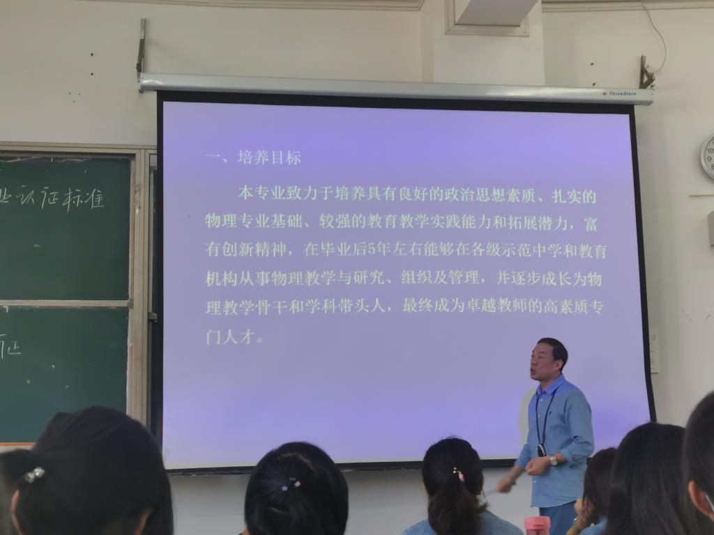 物理科学与技术学院讯(通讯员 潘姿杏)10月20日上午,物理科学与技术学院开展了普通高等学校师范类专业认证(二级)实施工作说明会。本次活动由学院副院长吴少平教授主讲,由2019级辅导员高玉茜老师主持,物理科学与技术学院2019级师范类专业全体学生参加了此次活动。