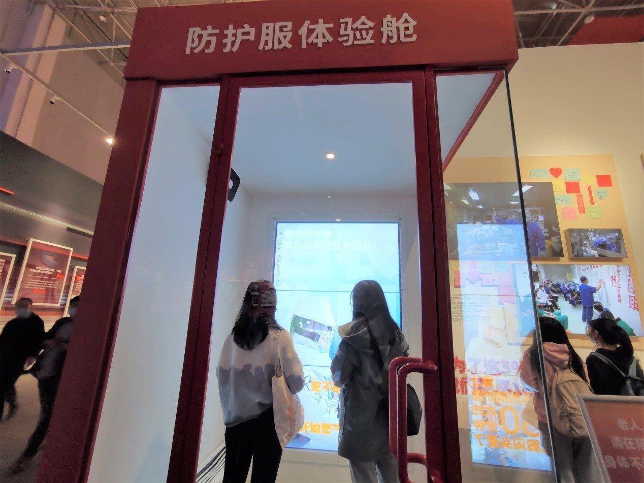 武汉客厅既是展厅,也是曾经的方舱医院,它沟通了时间的桥梁:数月前的生死线仿佛触手可及,医患间的点点温情似乎历历在目。同学们不由屏气凝息,放慢脚步,认真参观学习。何安琪同学走进防护服体验仓,推开门时不经感慨:“他们怎么能忍受一整天?”刘菁璇同学在一张医患同看落日余晖的照片前驻足,轻念:“陪你看夕阳,人间很值得”。程昕辉、程远之、耿家奇、王印龙四名同学电子献花纪念英雄,四人深深鞠躬,沉默良久。
