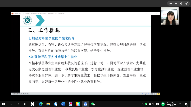 随后,刘琦就年级整体就业进度以及非师范专业基本情况进行了介绍。刘琦细致梳理了非师范专业学生就业、考研等情况,并指出现存的主要问题。她就学院已开展的促进就业、学风建设等工作进行了汇报,提醒毕业生和家长及时关注校院与毕业就业相关的信息。