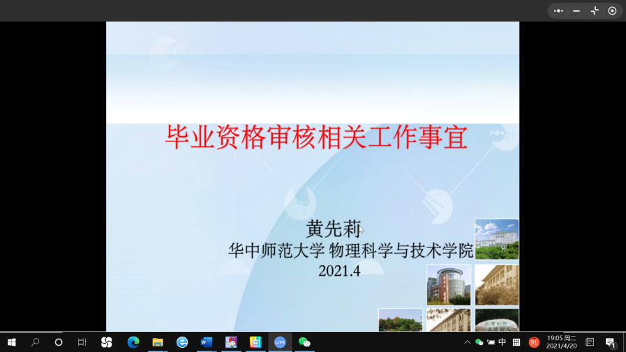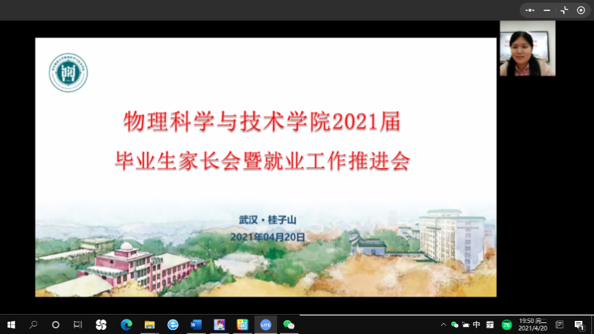 (通讯员 姜梦圆)为巩固党史学习教育成果,推进“我为师生办实事”实践活动,助力毕业生顺利毕业和就业,2021年4月20日晚,物理科学与技术学院2021届毕业生家长会暨就业工作推进会于企业微信平台举行。本次会议就毕业生和家长关心的年级就业进展、毕业资格审核、就业形势分析等重要内容进行讲解。学院党委书记张明生、党委副书记马英、教学副院长吴少平、教学秘书黄先莉、2021届毕业生辅导员刘琦、孙慧敏参加会议。会议由刘琦主持,全体2021届本科毕业生及家长以线上的方式参与活动。