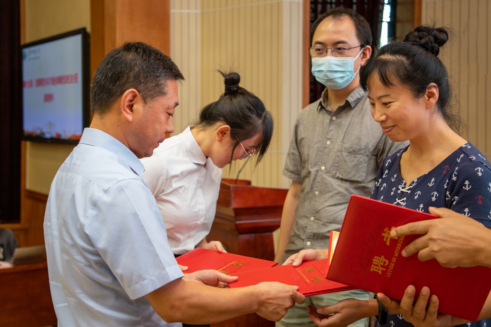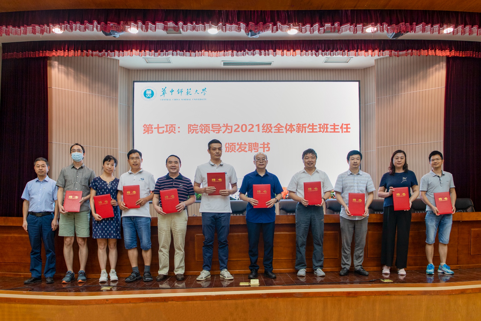 2021年,学院为新生精心选聘了13名热心学生工作、潜心教书育人的班主任老师。党委书记张明生为新生班主任代表颁发聘书并合影留念。