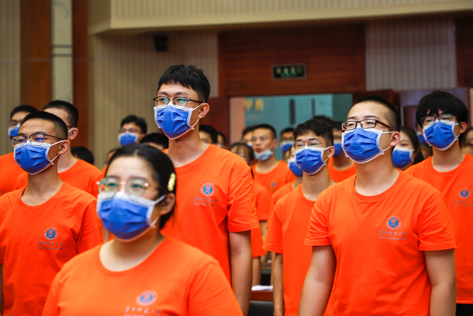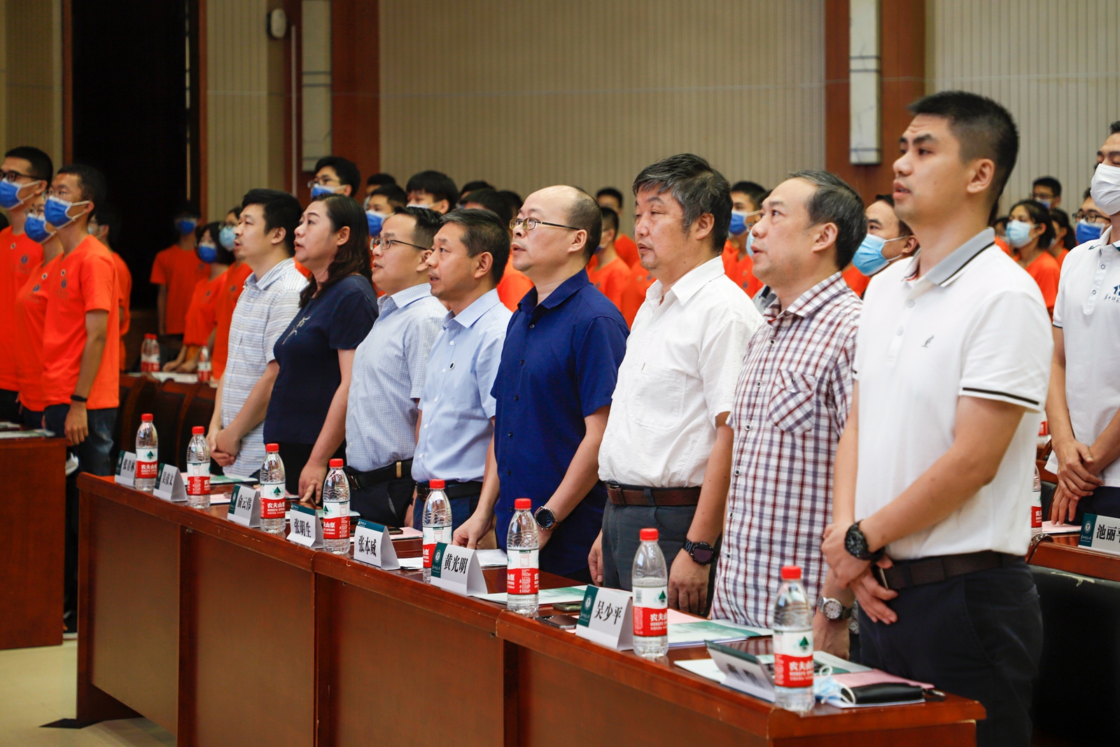 典礼正式开始,全体起立,唱国歌。
