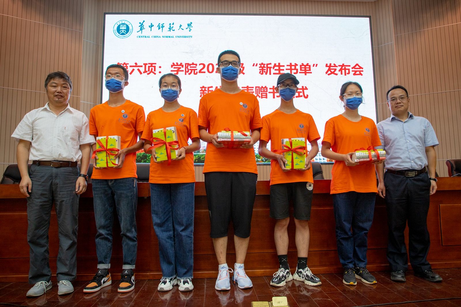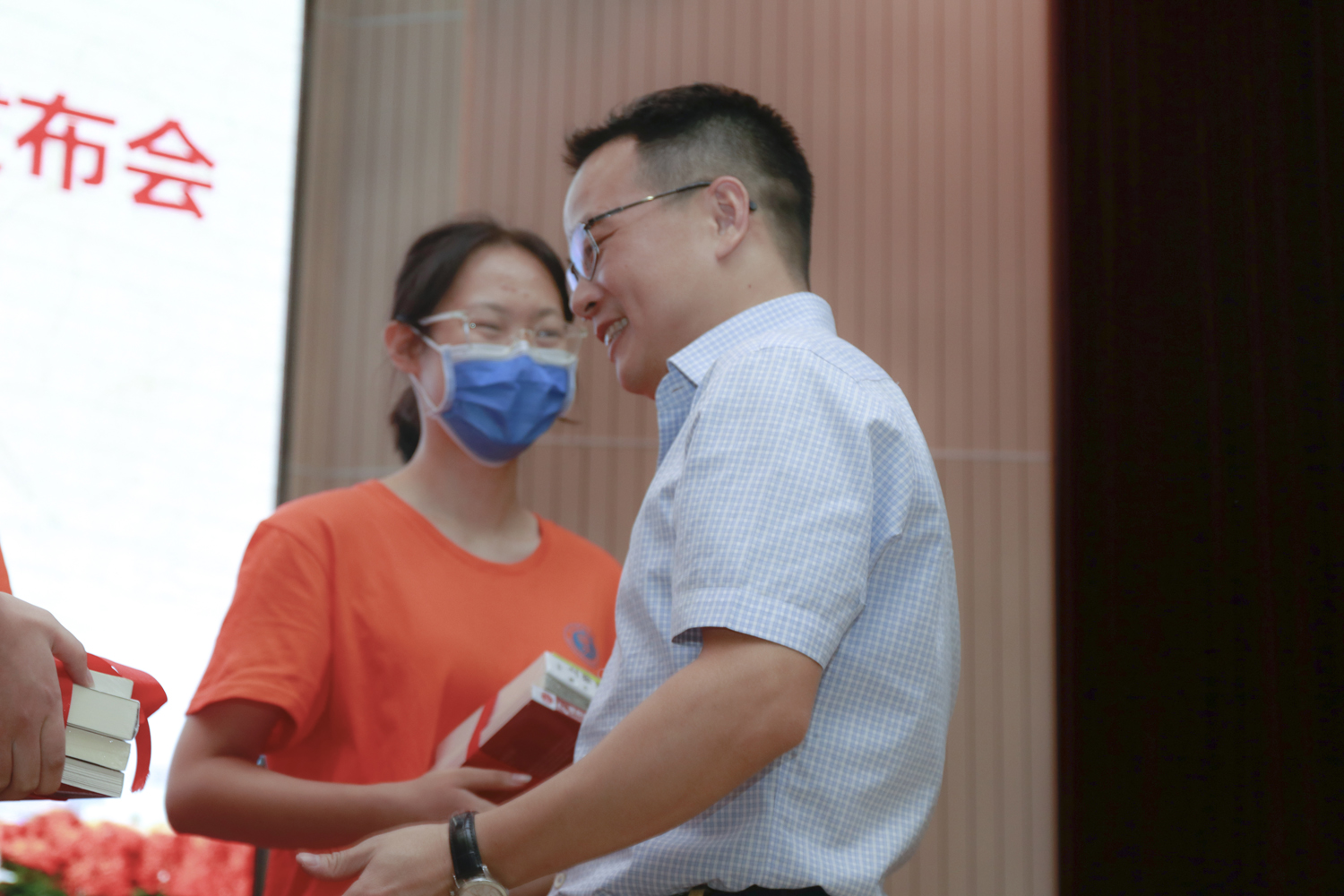 为营造优良学风,培养新生爱读书读好书的学习习惯,典礼特别策划并组织“新生书单”发布会和赠书仪式。新生报到之前,学院团委在全体教职工中开展了第二届向新生推荐好书的活动。老师们踊跃参与推荐,印制精美的“新生书单”是学院送给新同学的第一份“见面礼”。黄光明教授、俞云伟教授为新生代表赠书。