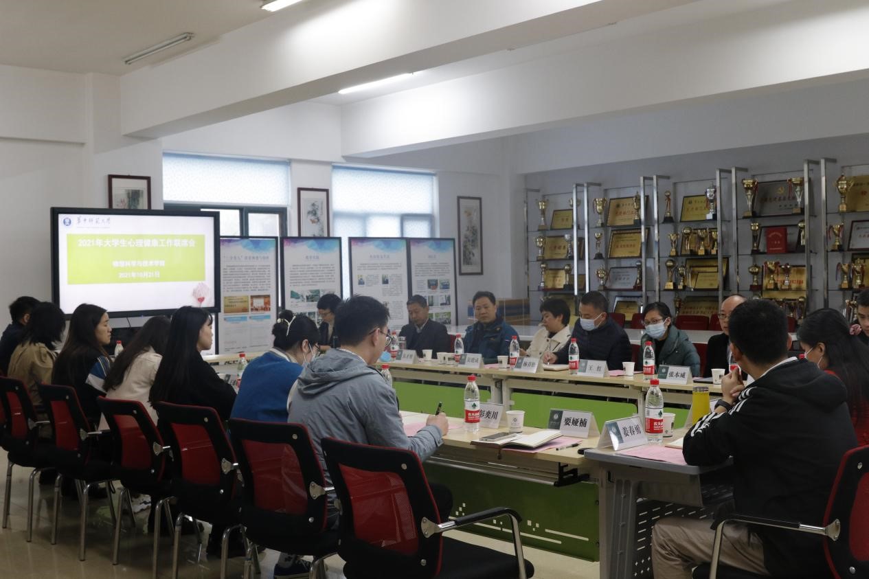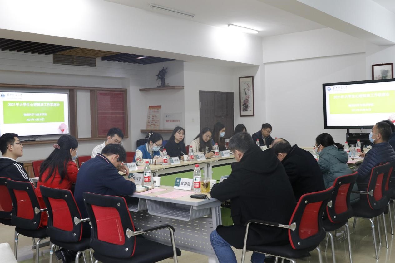 (通讯员 要娅楠)10月21日上午,物理科学与技术学院2021年大学生心理健康工作联席会于九号楼9551会议室召开。学工部副部长、大学生心理健康中心主任吴建成,研究生院副院长杨青松,校医院副院长王红,心理健康中心副主任吴才智到会指导交流。我院党委书记张明生、院长张本威、党委副书记曹阳、党委副书记马英、全体本科生、研究生专兼职辅导员以及班主任代表参加会议。会议由马英主持。