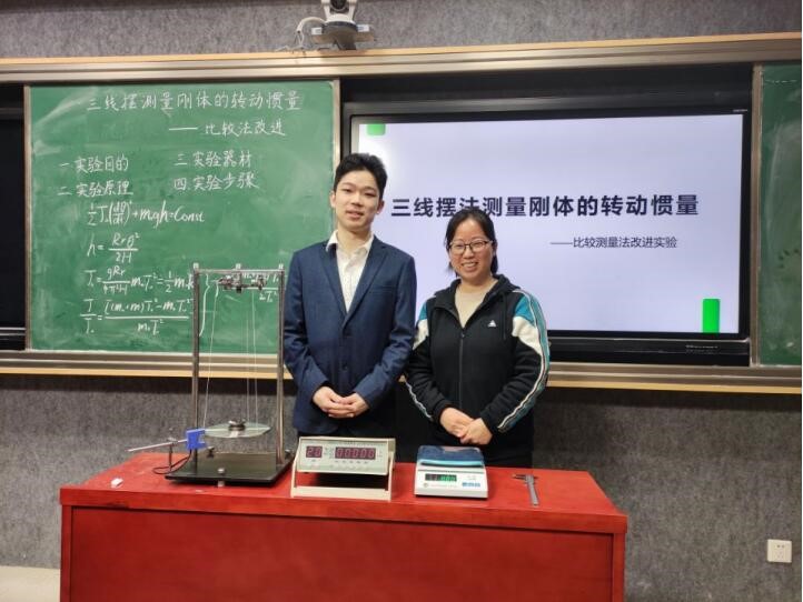 “转动惯量在工业制造、航空航天等诸多领域都是一个十分重要的物理参量。”在大学物理的学习中,转动惯量的学习处在力学的基础阶段,但测量转动惯量的实验却被2019级本科生熊泽坤同学寻出了亮点。熊泽坤同学《基于比较法改进的三线摆测量转动惯量实验》,以二级物理实验中的实验为基础,在杨利建、乔翠兰两位老师的指导下,运用物理测量中常用的“比较测量法”的思想改进了实验。