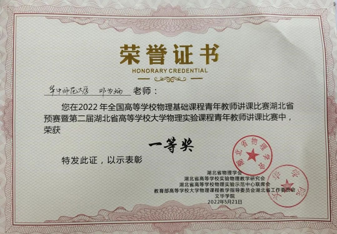 祝贺|邓为炳老师获湖北省第二届“锐族杯”高等学校大学物理实验课程青年教师讲课比赛一等奖
