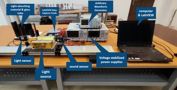 “光声效应实验仪”小组的张德邻同学谈到:“吸光物质从涂黑铝箔到碳粉到石墨烯再到炭黑;光源从日光灯到手机频闪灯再到由大功率面光源、MOS管驱动电路、稳压电源、任意波形发生器组成的大功率频闪灯。实验上无数次的失败,差点让我们放弃了这个课题,戏剧性的是,就在我们即将准备放弃,重觅方向的那个下午,在最不被看好的材料上(蜡烛不充分燃烧产生的炭黑),成功了!还记得第一次听到光声的那个下午,那种感觉是如此的不真实,根本不敢相信就这样成功了。”