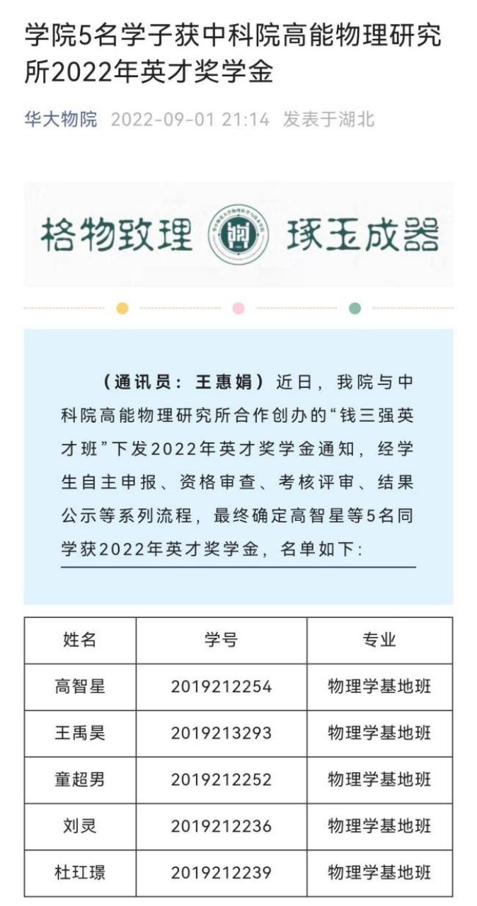 我院与中科院高能物理研究所合作创办的“钱三强英才班”下发2022年英才奖学金通知,经学生自主申报、资格审查、考核评审、结果公示等系列流程,最终确定高智星等5名同学获2022年英才奖学金,共计1万元。
