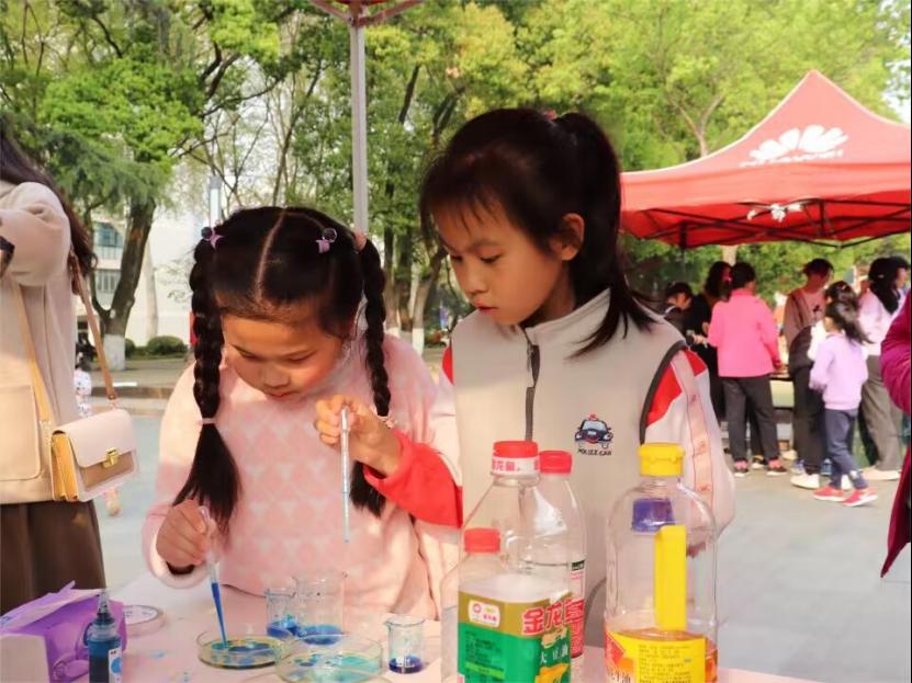 在志愿者演示富有趣味性的“链条喷泉”实验后,现场的参与者们由衷地感叹实验的奇妙。参与者亲手进行的“液滴爆炸”实验中,一个大的蓝色液滴落在油面之后,先在最外层产生较小的蓝色液滴,然后逐渐在其内部形成更小的液滴,就像是爆炸一样。在他们追问原理的时候,志愿者们耐心讲解,虽然现场的小朋友们仍然感到困惑,但这个小小的实验或许已在他们心中播下了探索科学的种子。