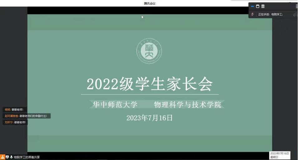 7月15日-19日,物理学院通过线上会议方式陆续开展本科生各年级家长会,学院1000余名学生家长参加会议。家长会由各年级专职辅导员主持,学院副院长吴少平和党委副书记马英参会,并分年级就学期工作总结及下学期工作展望同家长们做交流。本次家长会在各年级家长们中产生良好反响,普遍认为家长会帮助家长全面细致地了解了学校和学院工作,为下一步家长如何发挥作用、家校合力促进学生健康发展提供了方向指引。