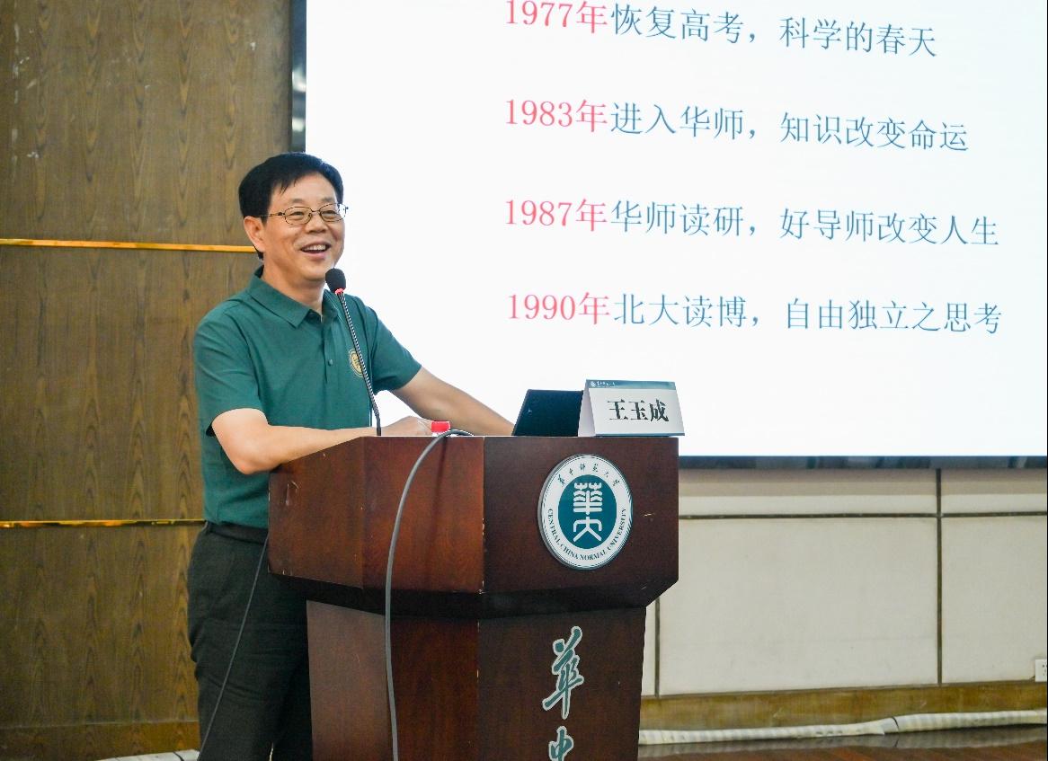 王玉成首先通过多个时间节点讲述了自己的成长故事。“我小时候的梦想很小,是知识改变了我的命运。”王玉成以幽默的口吻回忆了自己在华师的求学生活,从桂花香、南湖水到老师恩、同学情,他生动的讲述引起了同学们的共鸣。回望自己从本科到博士的学习生涯,王玉成感慨万千,他将物理知识融入人生道理之中,将学科特点与未来就业发展相结合,生动展示了他眼中的物理学科魅力。