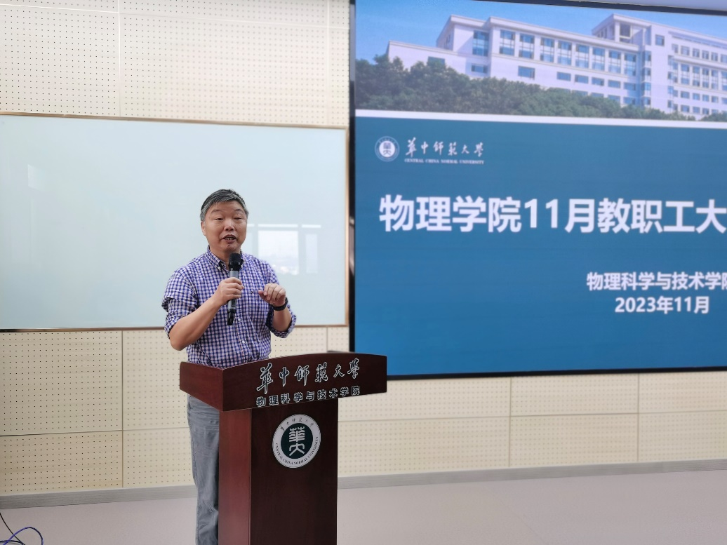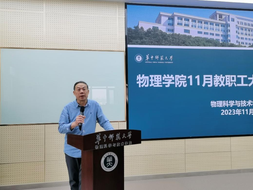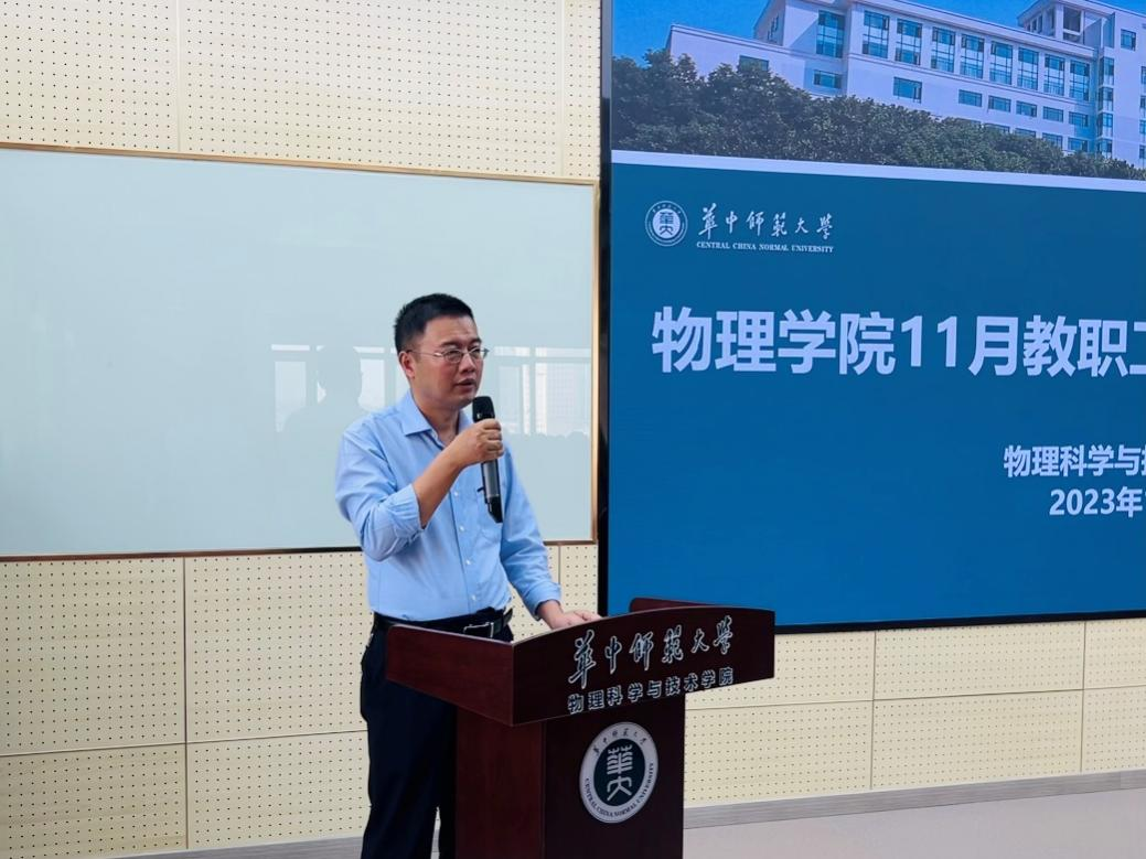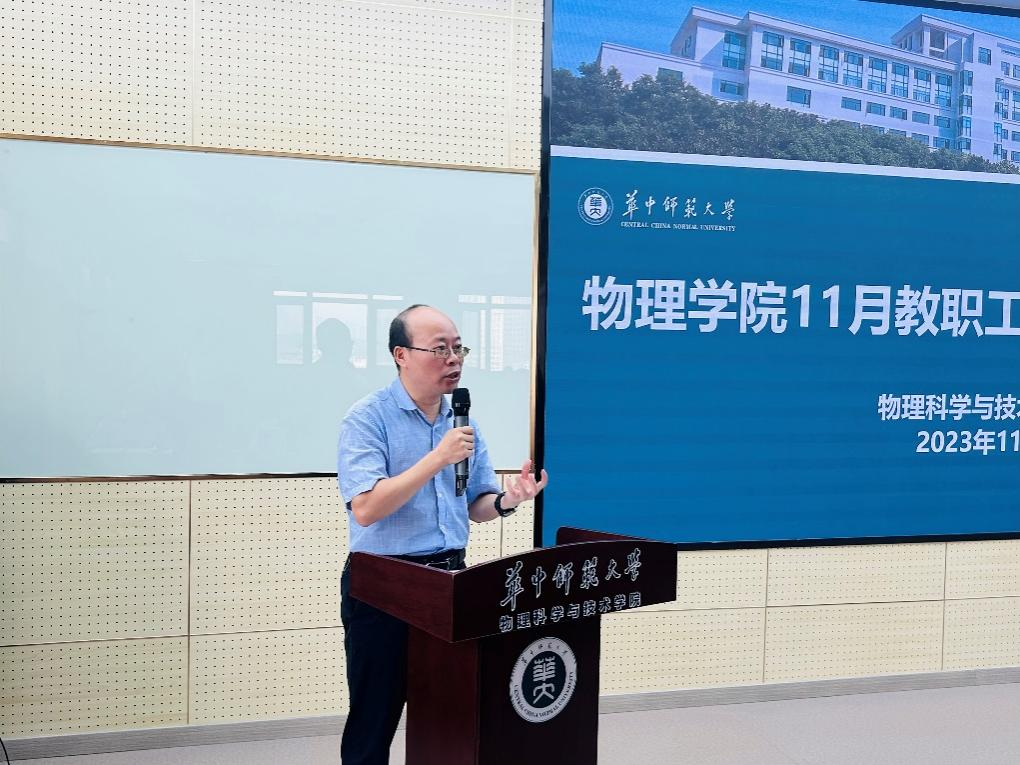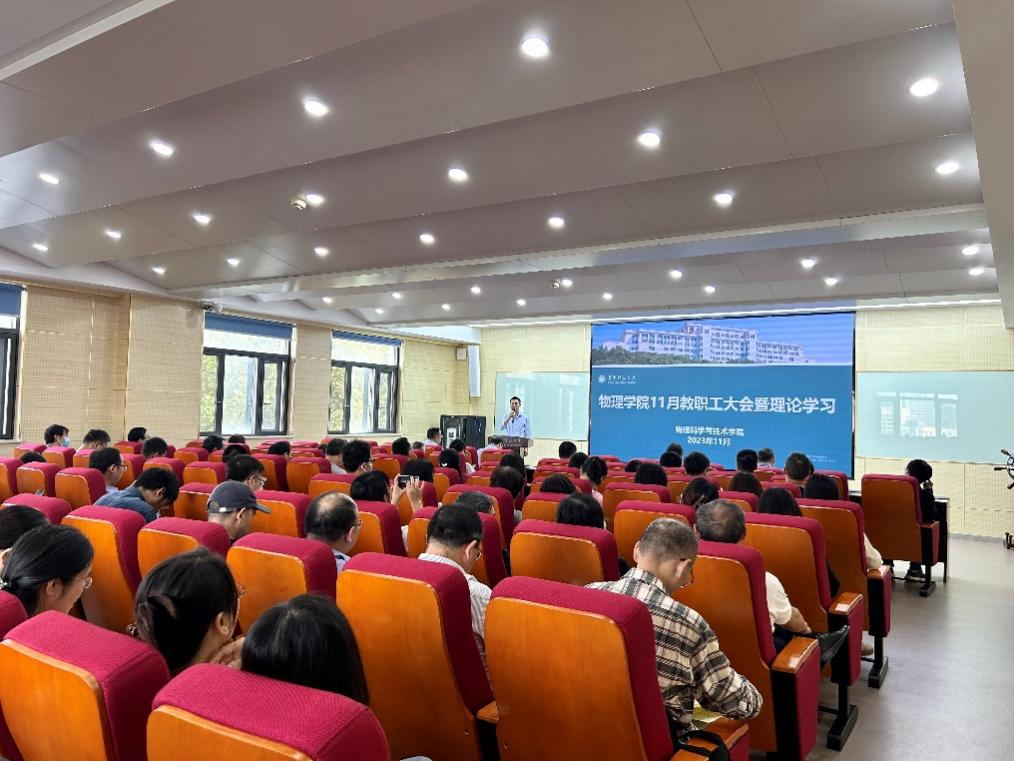 11月3日下午,物理科学与技术学院在9号楼5楼报告厅召开11月教职工大会暨政治理论集中学习,传达落实近期学校相关部门会议精神,进一步推进学院各项工作。院党委书记金新利主持会议。