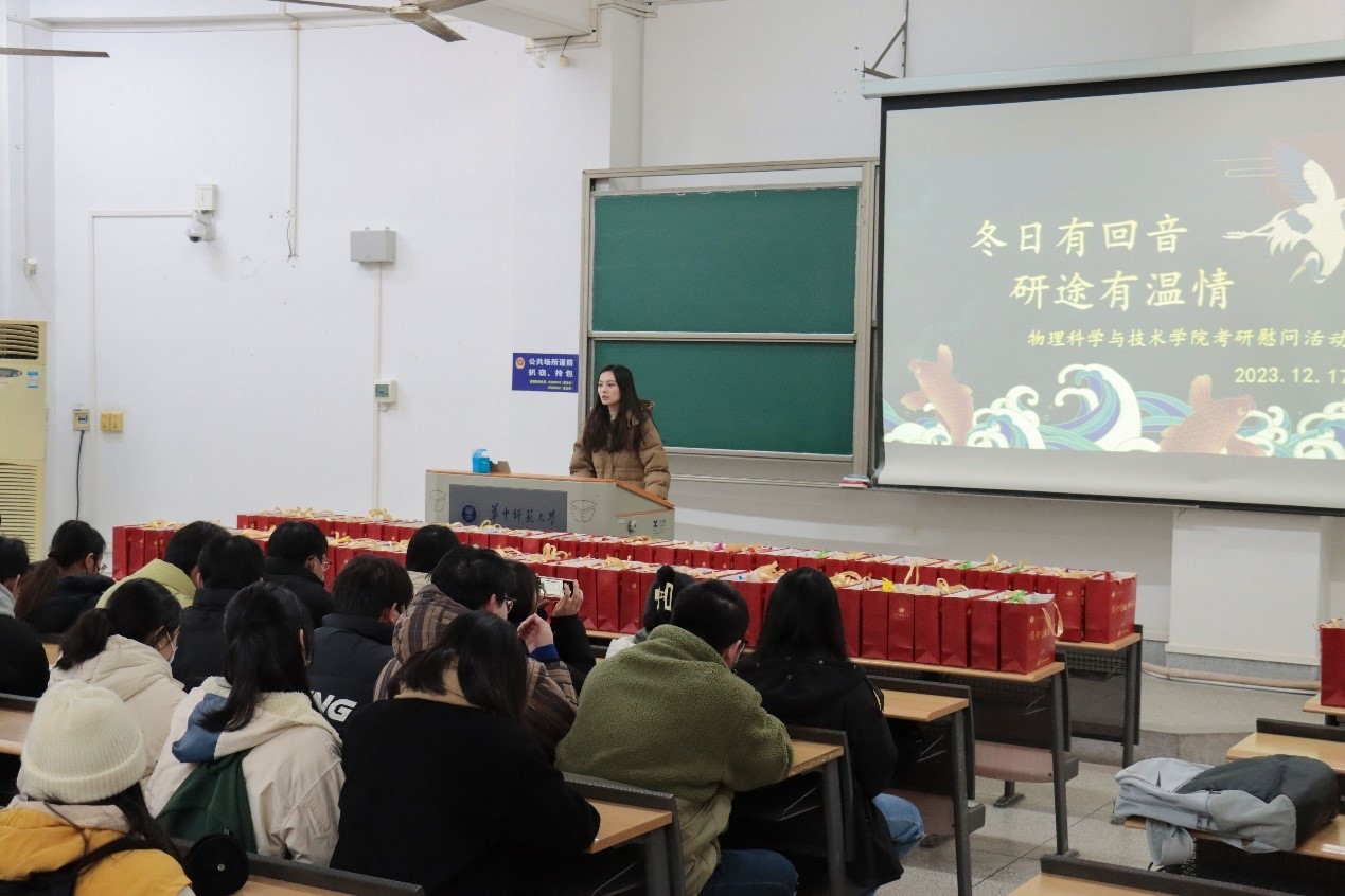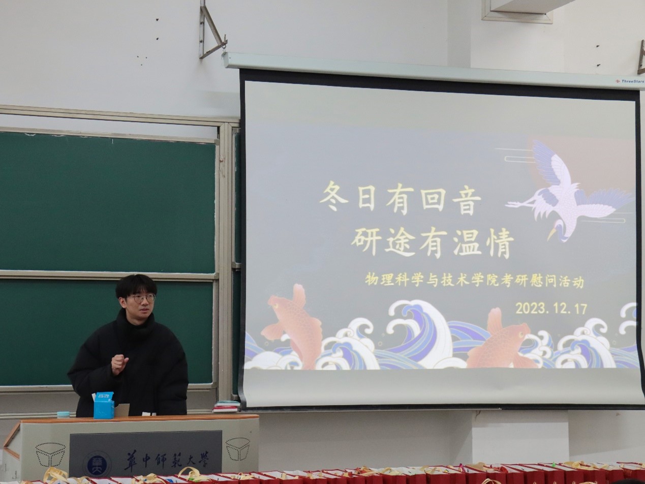 2024年全国硕士研究生统一考试已进入冲刺阶段,为帮助考研学子缓解备考压力,树立上岸信心,12月17日下午,物理学院“冬日有回音 研途有温情”2024届本科生考研慰问活动在九号楼9401教室举行。活动由学院2020级非师范专业辅导员成田主持,2020级师范专业辅导员王棣及学院六十余位考研学子参加活动。