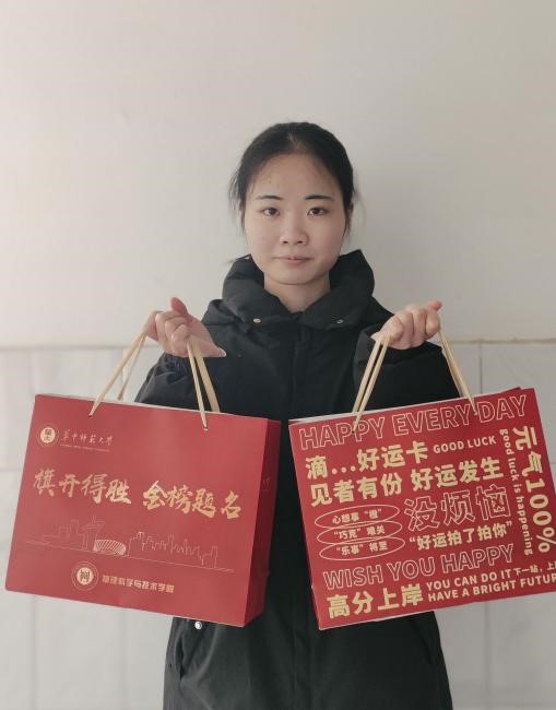 活动最后,辅导员老师和学生干部为考研学子分发满载学院领导、老师们和学弟学妹们暖心祝福的大礼包,每人两份,礼包×2,好事成双!