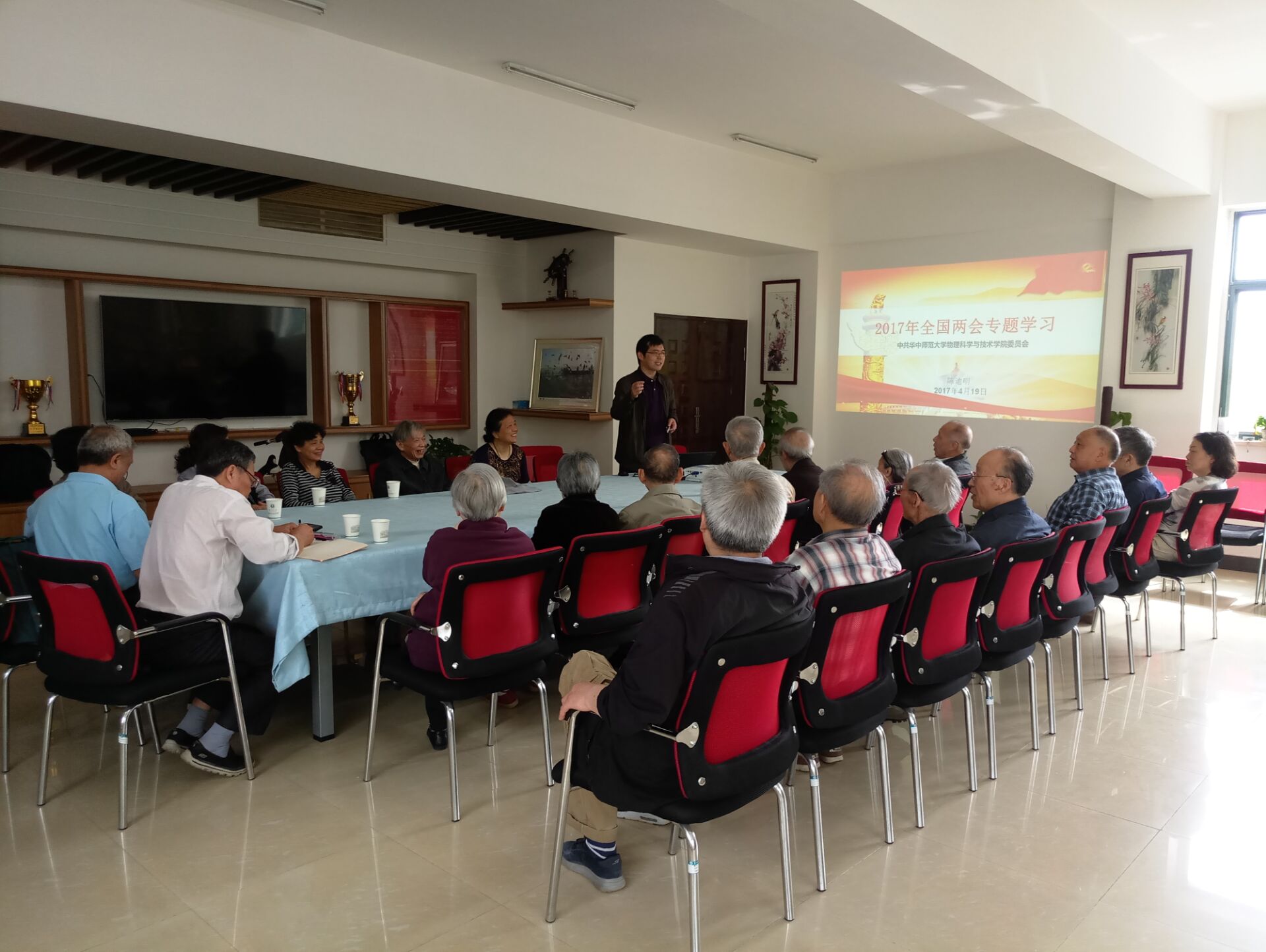 在中国人民政治协商会议第十二届全国委员会第五次会议和中华人民共和国第十二届全国人民代表大会第五次会议胜利召开之际,华中师范大学物理科学与技术学院从教师到学生,从党员到团员,从课内到课外,处处涌动着一股学习“两会”精神的热潮。4月19日,物理学院分党委书记陈迪明在学院党员事务中心给退休教工支部上了一堂题为“2017年全国两会专题学习”的党课,分别从“两会”简介、主要议程和会议内容三个方面内容详细解读了“两会”精神,并就学院退休支部如何贯彻“两会”精神作了重要指示。