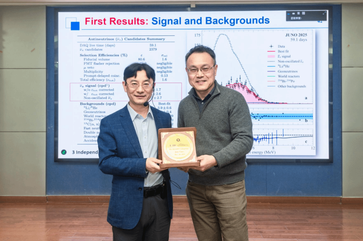 曹教授在报告中系统介绍了JUNO实验从提出、建设到取得首批科研成果的十年攻坚历程。JUNO是国际上三大新一代中微子实验中首个建成并运行的项目,位于地下700米,核心探测器为2万吨液体闪烁体,于2025年8月26日正式开始科学取数。曹教授特别指出,JUNO在11月19日发布的首批成果中,将中微子混合参数sin²θ₁₂和Δm²₂₁的测量精度分别提升了1.5倍和1.8倍,创造了50年来该领域的最佳测量纪录。