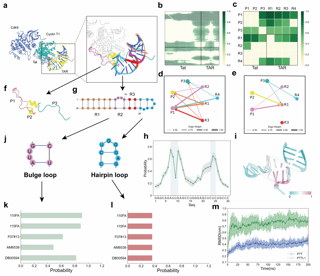 图2. P-TEFb/Tat/TAR体系的动态机制识别与调控。a P-TEFb/Tat/TAR体系的示意图. b 基于对Tat/TAR复合物的MD模拟,通过神经关系推断(NRI)学习得到的残基/核苷酸间相互作用边的分布。c 通过对残基/核苷酸级别的相互作用边进行聚合后获得的结构域间相互作用边分布。d和e 基于学习得到的相互作用边识别并映射出的Tat与TAR之间的相互作用结构域;箭头方向表示相互作用边的方向性,即从源结构域指向受影响的目标结构域。f和g 根据二级结构对Tat 蛋白与TAR RNA进行的结构域划分。h和i 由利用基于网络信息的ML方法 RNet计算得到的TAR RNA功能性结合位点的预测概率分布。j TAR RNA的Bulge loop与Hairpin loop结构示意。k 抑制剂与TAR RNA Bulge loop区域的结合概率。 l 抑制剂与TAR RNA Hairpin loop区域的结合概率。m P-TEFb/Tat/TAR体系在无抑制剂与抑制剂结合状态下主链均方根偏差(RMSD)的比较。