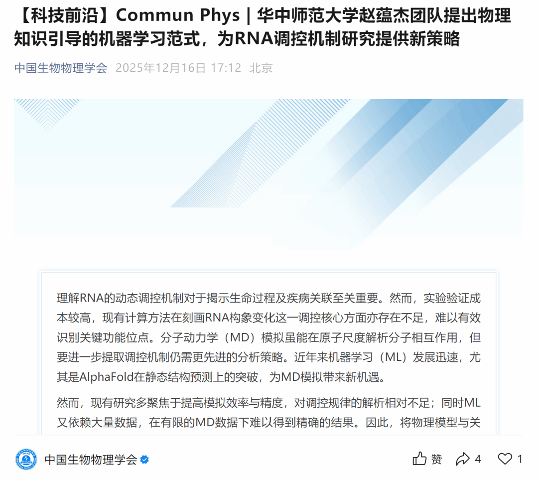 近日,物理科学与技术学院赵蕴杰教授课题组与浙江大学物理高等研究院朱亚南研究员团队合作在自然系列子刊《通讯 物理》(Communications Physics)发表了最新研究成果“RNA regulation mechanisms study using physics-informed machine learning”,提出了基于物理知识引导的机器学习计算框架ZHMolRM (RNA Mechanism),为解析RNA复合体的动态调控机制提供了新思路。研究内容被中国生物物理学会作为科技前沿报道。