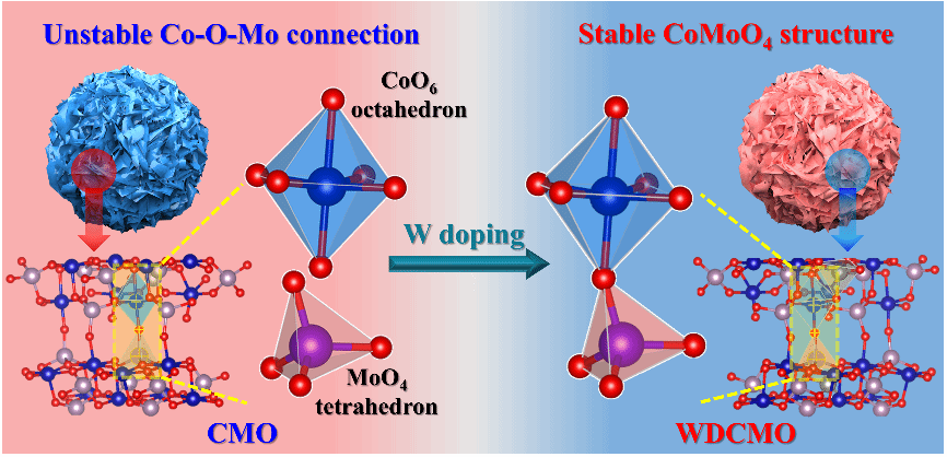通过W掺杂提高CoMoO4稳定性的示意图