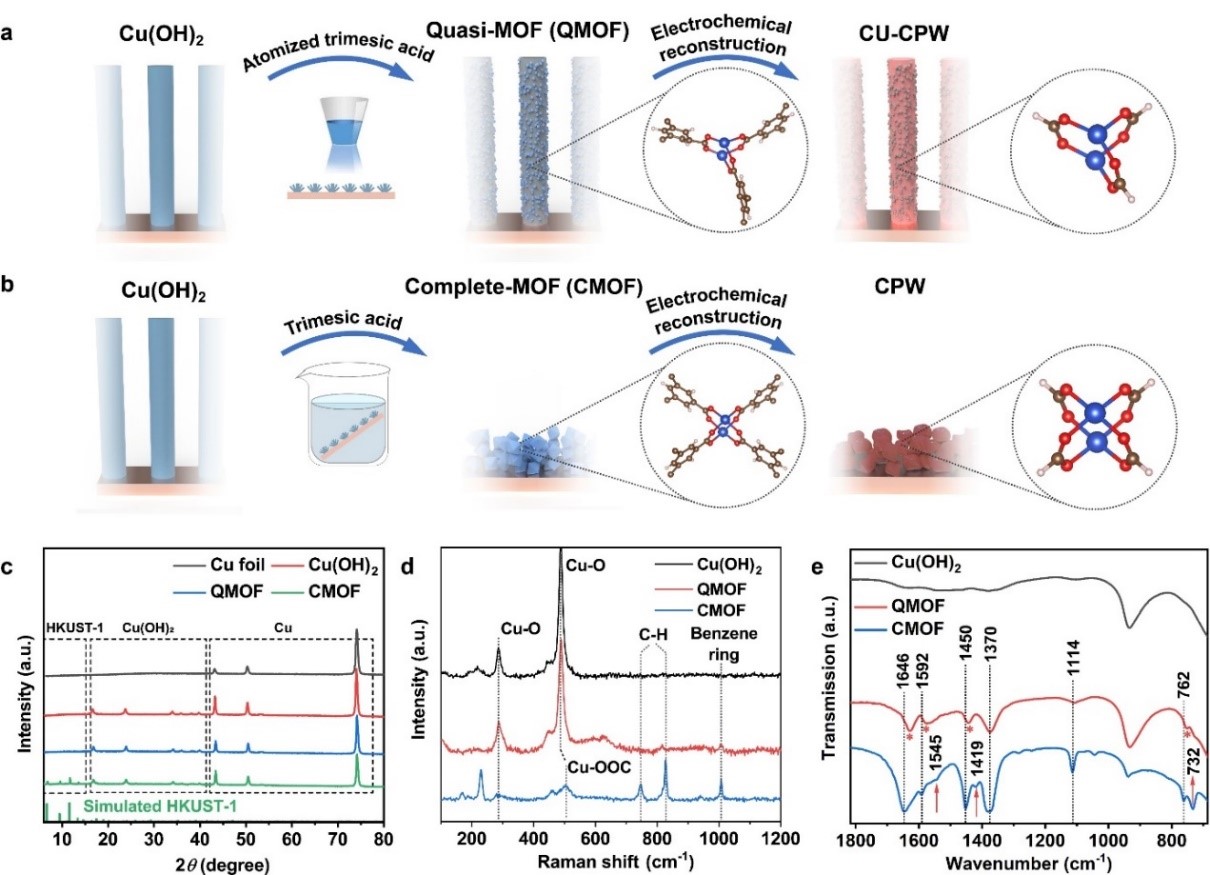 (图a,“雾化均苯三甲酸”策略制备配位不饱和铜浆轮(Coordinatively Unsaturated Cu Paddle Wheel,CU-CPW)簇;图b,常规 “浸渍法”制备配位饱和铜浆轮。)