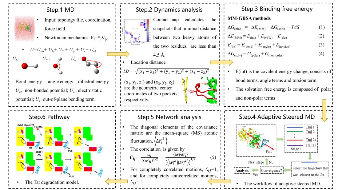 针对以上挑战,赵蕴杰教授课题组于2020年发展了基于分子动力学模拟的动态网络分析模型,该方法可以定量计算复合物间多体相互作用的微小变化。结果表明,病毒蛋白Tat突变产生的相互作用变化的理论预测与实验结果一致,解释了HIV病毒Tat突变导致的潜伏期机理,该工作以封面论文发表于Physical Chemistry Chemical Physics (2020,44: 25474-25482)。在此工作的基础上,课题组进一步发展了全原子增强采样模型预测抑制剂对病毒蛋白Tat降解产生的影响。动力学网络分析可以定量计算病毒Tat与宿主蛋白之间的微小相互作用变化,基于增强采样的拉伸动力学可以扩大并预测抑制剂对复合物体系的影响。结果表明,蛋白靶向抑制剂可以破坏Tat/P-TEFb间的相互作用,促进Tat从复合物解离并被降解。反之,RNA靶向抑制剂可以抑制Tat与P-TEFb之间的解离,减少Tat的降解。两种靶向抑制剂的理论预测结果均与实验结果完全一致。该研究工作为人类免疫缺陷病毒潜伏期问题的机理研究,开发相关的靶向药物提供了新的思路。