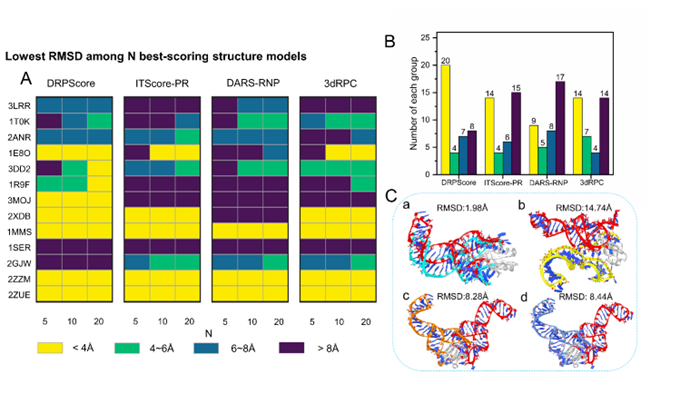 赵蕴杰教授课题组发展了基于人工智能和统计物理模型相结合的新方法DRPScore(图1)。该方法通过分子对接模拟复合物结合的构象变化,可以考虑柔性对接中分子结构的变化。另一方面,该方法聚焦于RNA-蛋白质相互作用界面,通过4DCNN模型不仅可以有效学习原子质量、原子电荷、相互作用类型(静电相互作用、氢键等)和相互作用距离的局部特征,还可以学习复合物二级结构相互作用(RNA为配对、发卡环和内环等;蛋白质为螺旋和beta折叠单元)与口袋拓扑结构等全局特征。