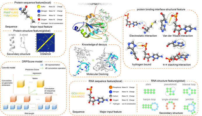 图1. DRPScore模型训练中学习的RNA-蛋白质复合物特征与4DCNN深度学习模型。