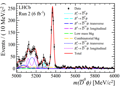 2022年引进的周晓康副教授在LHCb实验主导完成一项研究,发现了B^0→D ̅^(*)0 ϕ衰变过程存在的证据(图2),并更新了B_s^0→D ̅^(*)0 ϕ过程的衰变分支比,这些衰变过程能为测量CKM相角γ提供新的途径,有助于进一步检验标准模型的CP对称性破缺机制。相关论文已被《高能物理杂志》(Journal of High Energy Physics)正式接收,即将发表。周晓康于2023年9月18-22日在西班牙圣地亚哥德孔波斯特拉举行的第12届“国际CKM夸克混合机制研讨会”上报告了与γ相角测量相关的研究结果。