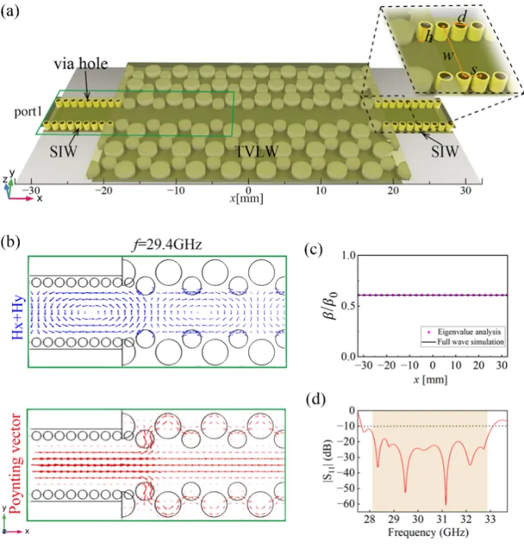 图2:所提出的间隙波导拓扑传输线结构及仿真结果