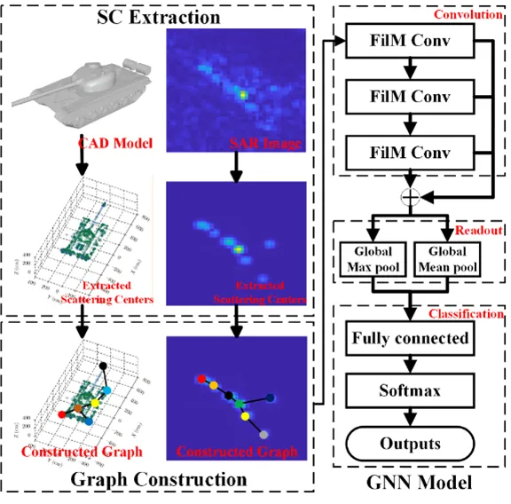 在雷达领域,机器学习辅助合成孔径雷达(SAR)自动目标识别(ATR)方法得到了广泛的关注和应用。但在扩展工作条件下(EOC),由于雷达成像条件的变化,特别是当雷达成像俯角变化较大时,性能较差。课题组提出了一种基于散射中心特征和特征线性调制(GNN-FiLM)图神经网络的SAR ATR方法。通过将散射中心进行物理参数量化表示,将物理特征以图的形式引入到GNN-FiLM的训练中。通过GNN-FiLM提取和学习结构特征和物理信息,该方法在SOC下对三类目标进行了良好的识别实验,在MSTAR数据集上大俯仰角变化的EOC下,准确率提高了4.9%。相关工作以“Attribute Scattering Center Assisted SAR ATR Based on GNN-FiLM”为题发表在IEEE Geoscience and Remote Sensing Letters (2024.04.19)(影响因子5.5)上,DOI: 10.1109/LGRS.2024.3391323。2022级博士研究生侯俊杰为该论文的第一作者,我院林海副教授为该论文的通讯作者,华中师范大学为该论文的第一完成单位。
