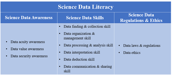 对于STEM专业的大学生来说,提升科学数据素养显得尤其重要,因为他们目前的学术发展和未来的职业生涯都可能直接或间接地接触大量科学数据。目前全球范围内对学生科学素养的内涵界定都包括科学数据的收集、分析、解释和论证,但是其往往强调的是通过实验探究获得少量数据,并展开分析的能力。随着科学数据的指数增长,从大量数据集中提取潜在价值并解决科学问题越来越普遍。仅仅专注于实验室范围内的科学数据技能已经不足以满足海量科学数据的挑战。例如,虽然学生可以处理少量实验数据,但在面对大规模数据集时,他们该如何识别有价值的科学数据,如何系统地组织、管理、分析和解释科学数据,如何合乎道德地使用公开数据集?因此,迫切需要提出一个系统的科学数据素养概念框架。