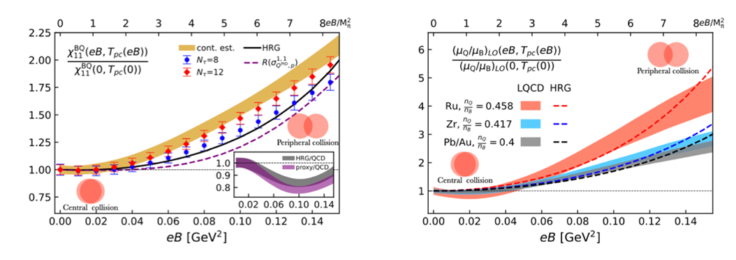 附图展示了重子数和电荷数的关联(左图)和电荷化学势与重子化学势之比(右图)对磁场强度的依赖。磁场强度一般从中心碰撞到边缘碰撞逐渐变大。