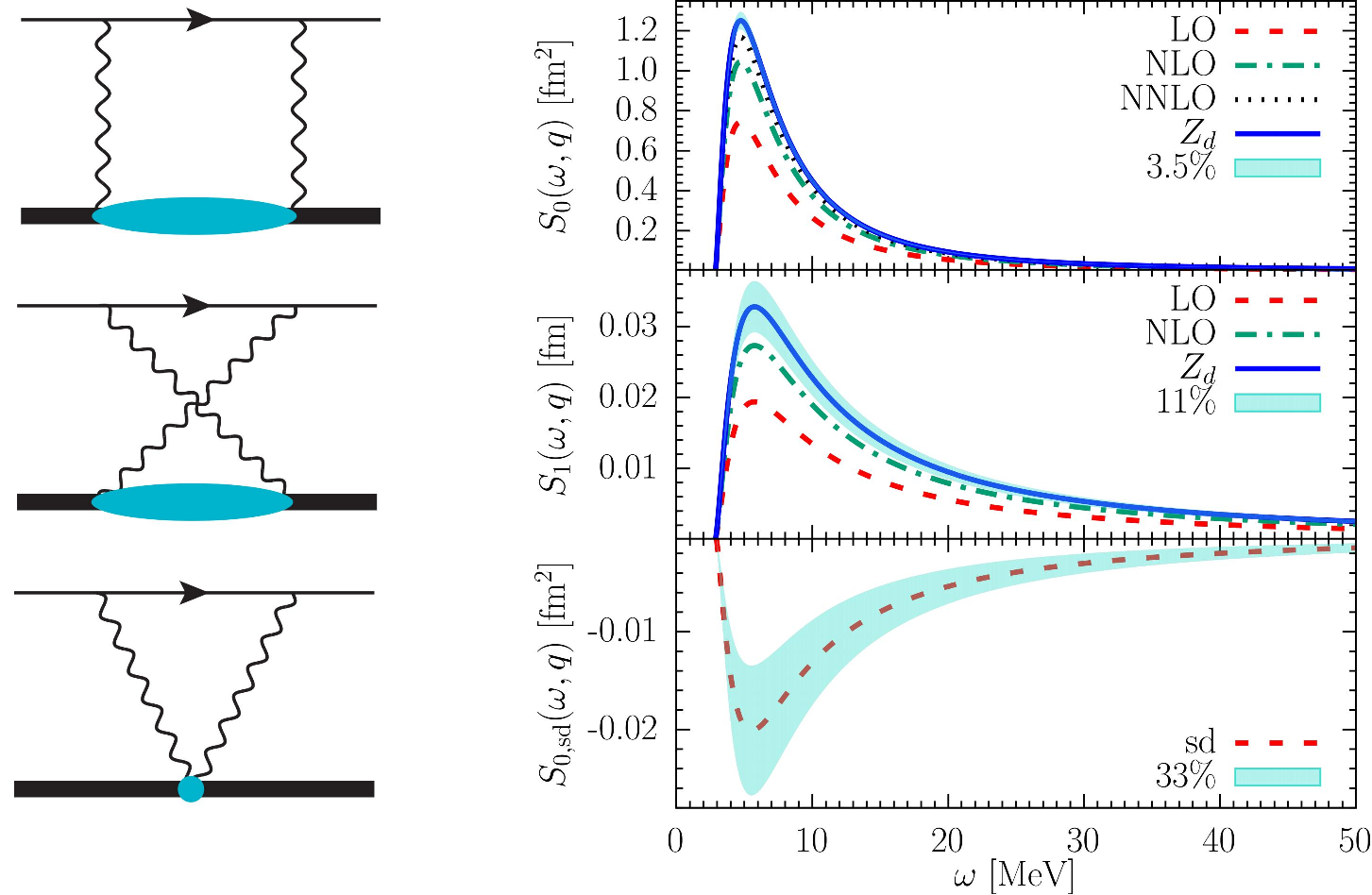 计晨课题组通过引入光核反应理论,严格计算了双光子交换中的原子核虚激发过程。结合无Pi介子有效场核力理论,该研究预测了氘原子1S态与缪氘2S态超精细劈裂中的双光子交换核效应修正分别为41.7(4.4) kHz和0.117(13) meV,取得了与实验测量一致的结果。这一研究解决了氘与缪氘原子超精细劈裂测量与QED预测之间长期存在的不一致性,突显了核结构效应对原子超精细劈裂谱的重要贡献,标志着在利用精密光谱学探测核结构方面取得了重要突破。