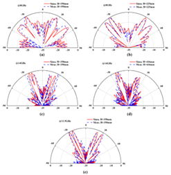 在无线通信系统中,针对轨道角动量(OAM)正交特性的涡旋波理论及应用研究具有重要意义。现有的多功能涡旋波发生器往往受到色散效应的限制,仅能在少数频率点或窄带内工作。传统的解决方案往往导致模式纯度随频率变化而下降,限制了其在高容量复用无线通信系统中的应用潜力。为解决这一问题, 课题组提出了一种在宽带条件下产生双模态OAM涡旋波的方法。该方法首先利用Pancharatnam-Berry(PB)相位概念,在单一介质基板上实现360°反射相位覆盖。随后,为解决宽带条件下超表面色散导致OAM模式纯度降低的问题,提出了距离反演法,通过仿真设计、模型制作和测量验证该方法的有效性。仿真和测量结果均表明,该超表面可在8-14 GHz范围内(54.55%相对带宽)产生l = -1和l = +2的OAM波束。在此频率范围内,l = -1和l = +2模式的测量OAM纯度分别超过86%和82%,OAM涡旋波结构模型及仿真与实验测试结果如图2所示。该研究提出的超表面在高容量多路复用无线通信系统中具有潜在应用价值。