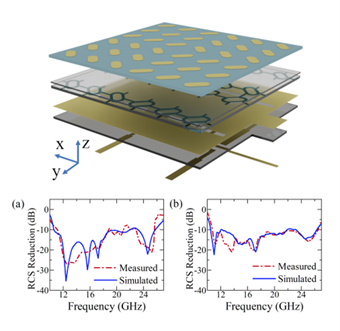 在电磁隐身领域,天线往往具有较强的散射特性,制约着系统整体的隐身性能,因此如何减小天线的雷达散射截面一直是重要的课题。课题组提出了一种利用混合机制进行散射缩减的方法,利用相位相消和吸波在宽频带内相的互补偿,设计了一款在10.6-26 GHz的超宽频带内具有低散射特性的水基超表面,并采用了辐射散射一体化的设计思路,用缝隙天线激励超表面,在不引入额外的辐射层的前提下使得缝隙天线的辐射和散射性能都得到了提高,混合机制水基超表面天线及仿真和实验结果如图1所示。该研究将水基天线和超表面引入了新的应用场景,为混合机制低散射天线的设计和分析提供了新思路。