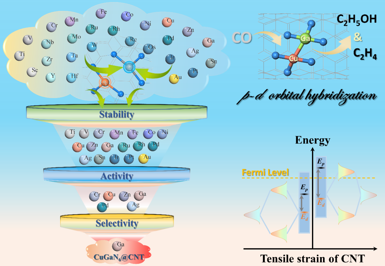 该研究将不同金属原子与Cu原子配位,并锚定在具有6个N原子缺陷的碳纳米管上,成功设计了一种新型的双金属原子催化剂(BAC)。工作旨在通过掺入金属原子来调控近邻的Cu原子的电子结构,提高整体的催化活性和选择性。通过高通量计算筛选比较了CO在28种BACs上的吸附、活化和偶联情况,并对CO电化学还原为C2H5OH和C2H4进行全路径计算。理论研究发现异核双金属原子催化剂CuGaN6@CNT在这一过程中表现出优异的催化性能,对产物C2H5OH的理论过电势低至0.23 eV。结果表明,Ga与Cu原子间的p−d轨道杂化作用,促进了CO的不对称偶联,表现出极佳的协同催化作用。研究还发现d带中心在这项工作中可以被作为预测CORR中C−C偶联反应性能的可靠描述符。此外,应变工程也是一种有效的调控策略,可以用来调控CuGaN6@CNT中活性位点的电子结构以改善催化剂的性能。其中,在0%~6%的拉伸应变下,CuGaN6@CNT中Cu位点的d带中心从-3.38升高至-2.57 eV,Ga位点的p带中心从-0.59抬升到0.72 eV。这种变化可以有效调节活性位点与CO之间的相互作用强度,并对C−C偶联效率进行有效调控,从而实现催化剂性能的显著提高。这项研究为高性能BACs选择性电化学还原CO为多碳产物提供了重要的理论基础。