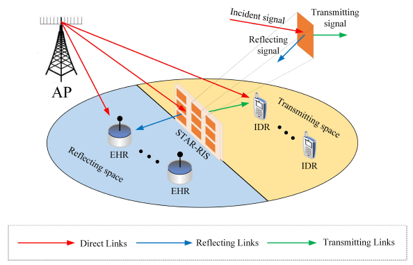 在无线携能通信领域,课题组提出了业界首个基于智能全向表面辅助的无线携能通信系统,该研究成果以“Weighted Sum Power Maximization for STAR-RIS Assisted SWIPT Systems”为题,于2024年10月发表在通信领域顶级期刊《IEEE Transactions on Wireless Communications》(中科院1区TOP期刊,DOI: 10.1109/TWC.2024.3467160)上,我院23级博士生李易轩为第一作者,王骥副教授为通讯作者,华中师范大学为第一完成单位。该工作的前期成果于2023年12月在通信领域国际顶级会议IEEE Global Communications Conference上进行汇报展示。