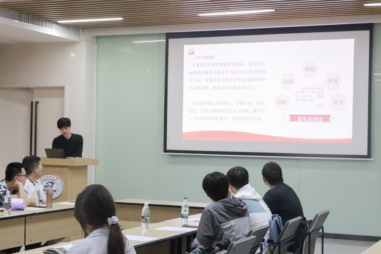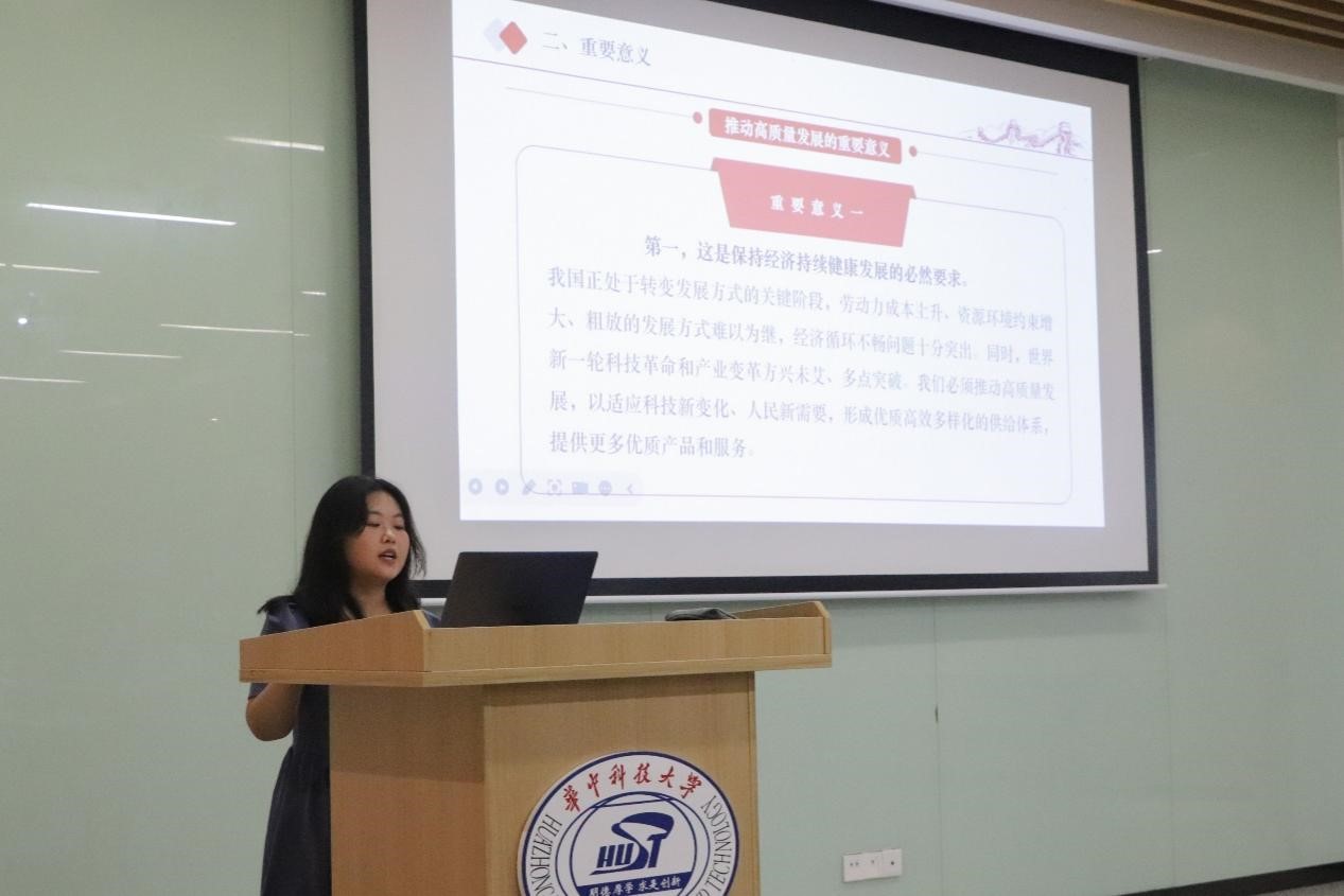 第三个主题由非师范专业本科生第二党支部江婧同志领学。她从推动高质量发展的深刻内涵、重要意义、实现要求三方面,深入解读习近平总书记关于开创我国高质量发展新局面的重要文章。