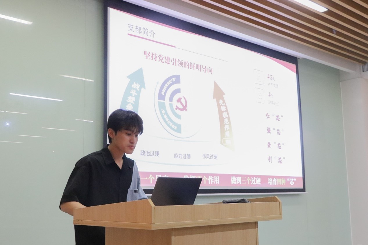 共同学习了三个主题后,两支部分别分享了各自在党支部建设方面的经验和做法。集成电路学院微电子专业本科生党支部陈胤元同志表示,支部以“矢志追寻强芯梦想 扎实铸造先锋力量”为核心理念,坚持党建引领的导向,充分发挥党支部在人才培养中的政治核心作用和战斗堡垒作用。党支部积极践行“四个‘芯’”的育人理念,确保党员队伍思想过硬、组织过硬、作风过硬。