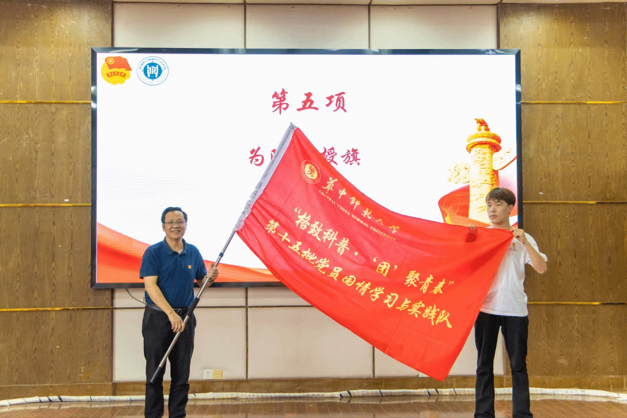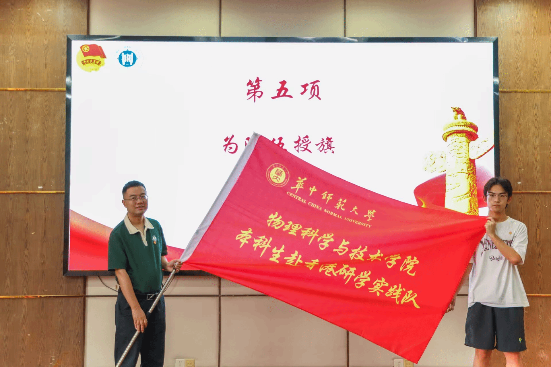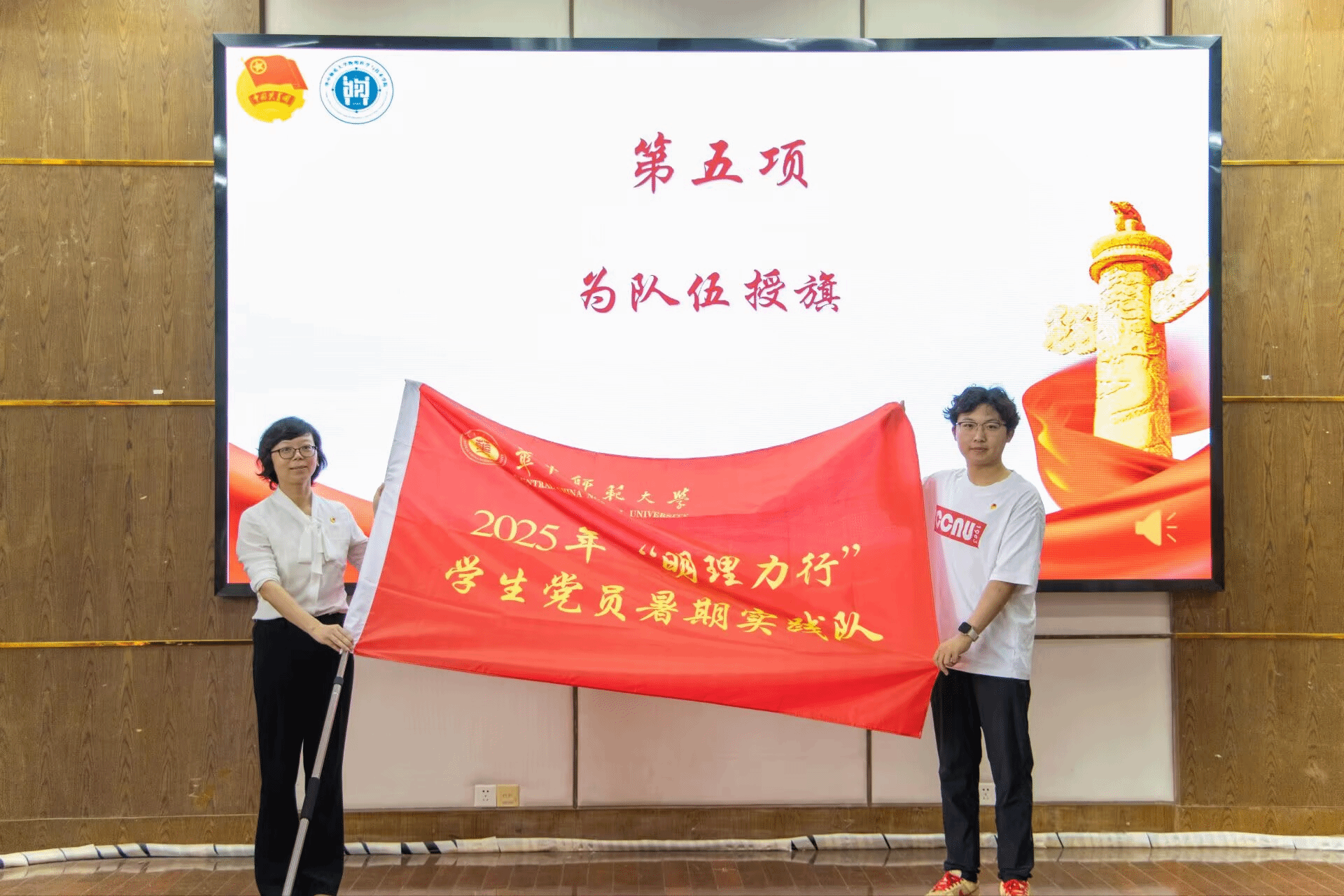 杨军为“第十五批党员国情学习与实践队”授旗,金新利为“香港研学实践队”授旗,马英为“‘明理力行’学生党员暑期实践队”授旗。