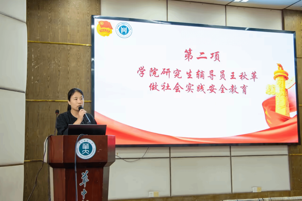 研究生辅导员王秋革强调安全第一,从交通安全、实践过程安全、财产安全、应急处理预案等方面做了详细提示,为同学们筑牢安全防线。