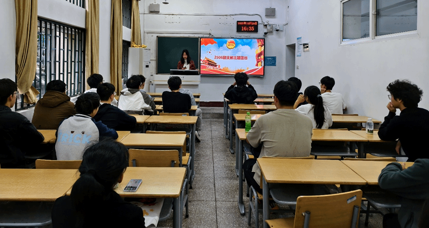 2025年10月29日,2506团支部在7106教室组织开展了一次主题为“把青春华章写在祖国大地上”的团日学习活动。团支书邹琳璇担任此次团日活动主讲人。此次活动旨在让同学们深入学习贯彻习近平新时代中国特色社会主义思想,引领团员和青年筑牢理想信念根基,厚植家国情怀,勇担时代使命。