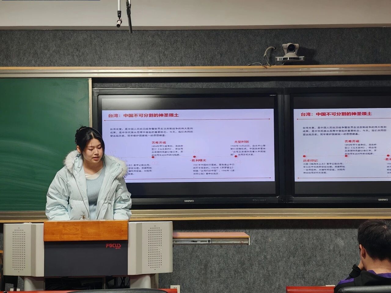 活动开始,主讲人陈孝涵以“台湾光复的前世今生”为切入点,带领同学们系统回溯台湾作为中国不可分割领土的历史脉络。从三国《临海水土志》对台湾的早期记载,到1894年甲午战争后台湾被迫沦陷的苦难历程,再到1945年台湾光复的胜利时刻,清晰的时间线与详实的史实梳理,让同学们深刻认识到台湾回归是中国人民抗日战争暨世界反法西斯战争胜利的重要成果,更加坚定“台湾是中国领土不可分割的一部分”的历史认知。