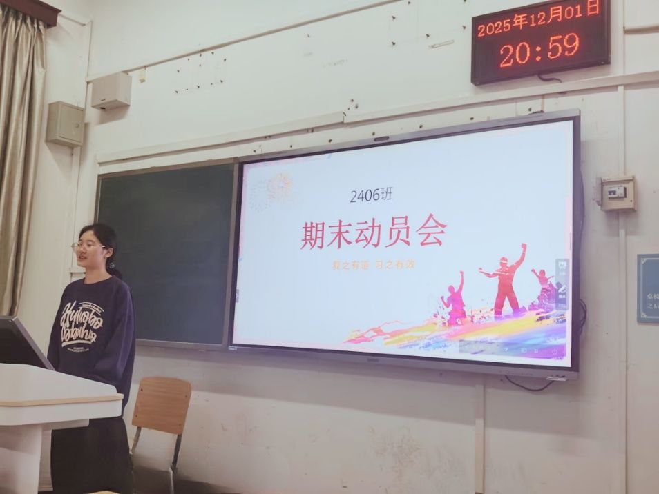 12月1日,物院2406班在7206教室组织开展以“复之有道 习之有效”为主题的期末动员班会。本次活动由班长谢辰雨主持,全体同学积极参与,旨在引导同学们明确复习目标、掌握科学方法、调整备考心态,以饱满的精神状态迎接期末考试。