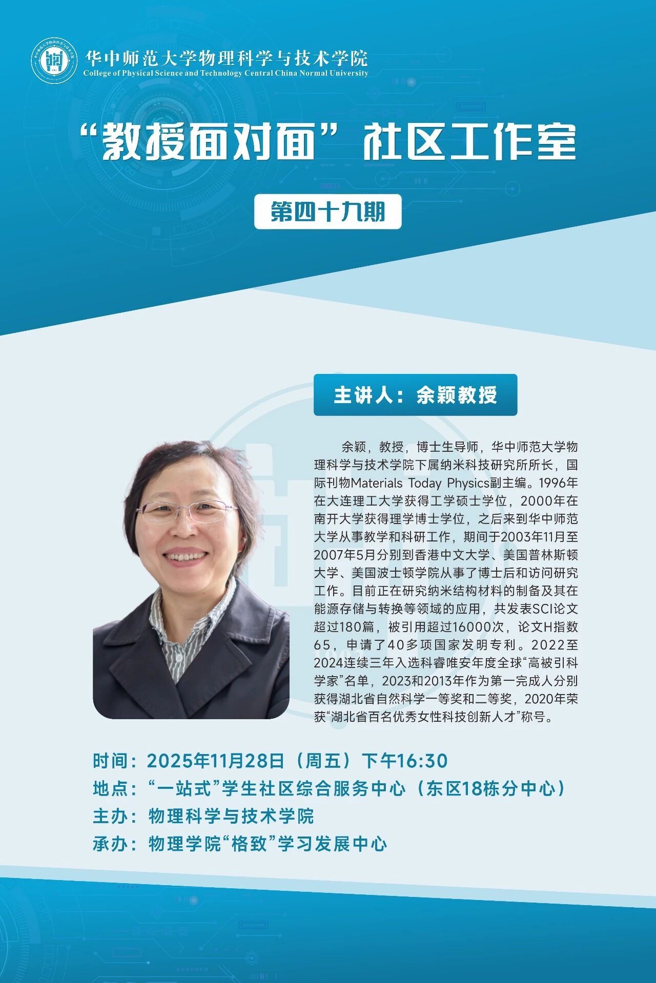 余颖,教授,博士生导师,华中师范大学物理科学与技术学院下属纳米科技研究所所长,国际刊物Materials Today Physics副主编。