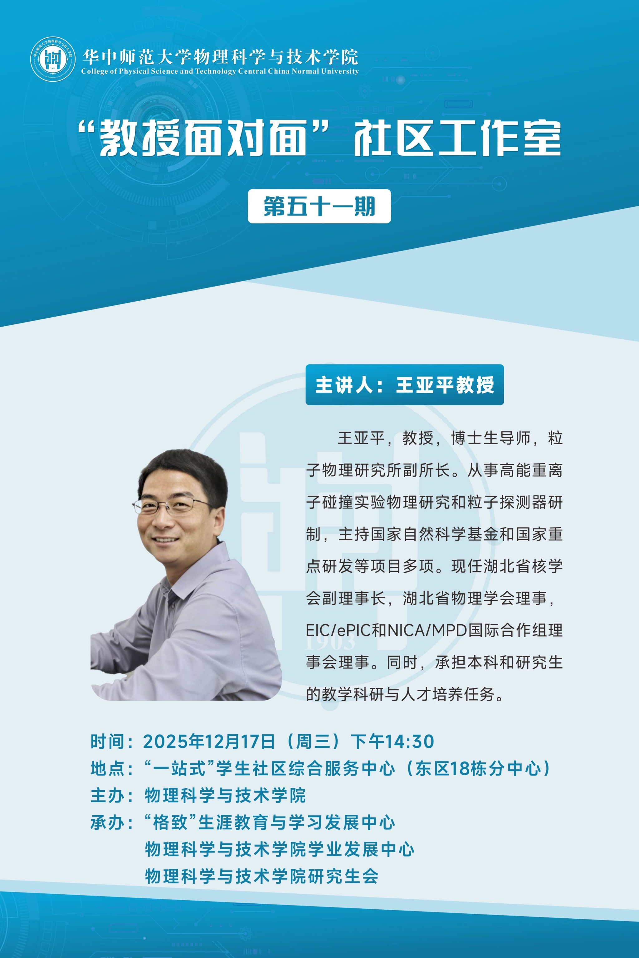 王亚平,教授,博士生导师,粒子物理研究所副所长。从事高能重离子碰撞实验物理研究和粒子探测器研制,主持国家自然科学基金和国家重点研发等项目多项。现任湖北省核学会副理事长,湖北省物理学会理事,EIC/ePIC和NICA/MPD国际合作组理事会理事。同时,承担本科和研究生的教学科研与人才培养任务。