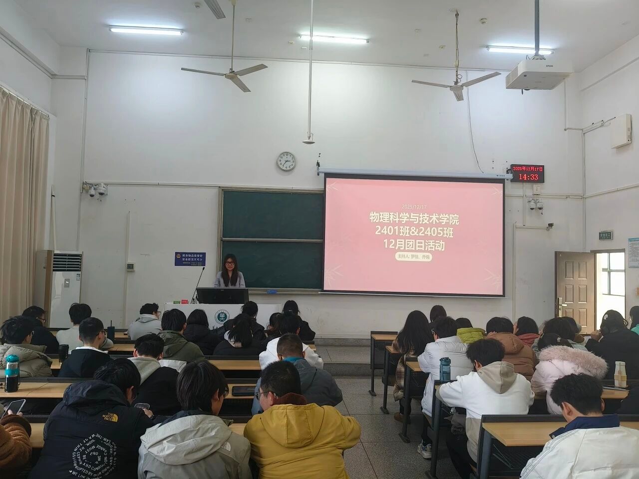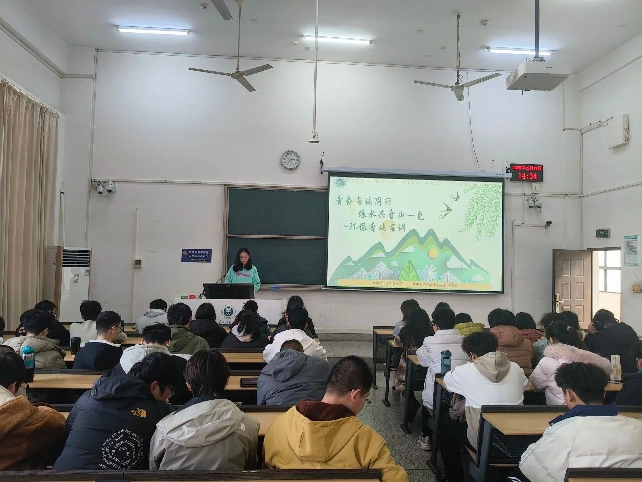 为强化同学们的环保法治观念,推动绿色低碳生活理念深入人心,12月17日下午14:30,物理科学与技术学院2405班与2401班全体同学齐聚九号楼9102教室,共同开展以环保普法为核心的主题团日活动。本次活动由2405班团支书罗佳和2401班团支书乔俏共同主持,特邀环保宣传相关负责人黄严知予同学担任宣讲员。